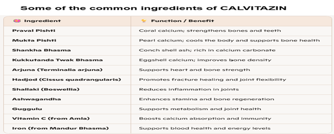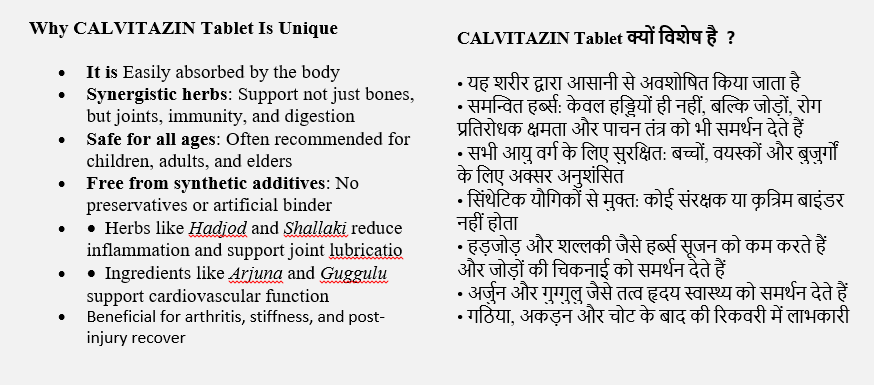 CALVITAZIN calcium tablet is fortified with natural sources of Vitamin D3, which provide a holistic approach to bone health rooted in centuries-old healing traditions. Unlike synthetic supplements, this Ayurvedic formulation draws from nature’s pharmacy—using mineral-rich herbs, plant-based calcium, and bioavailable Vitamin D3 to support bone density, joint flexibility, and overall vitality. CALVITAZIN is sourced from time-tested herbs and natural minerals, this supplement supports bone regeneration, immune resilience, and muscular strength. Ideal for those with limited sun exposure or dietary gaps, it’s a daily dose of vitality rooted in tradition.