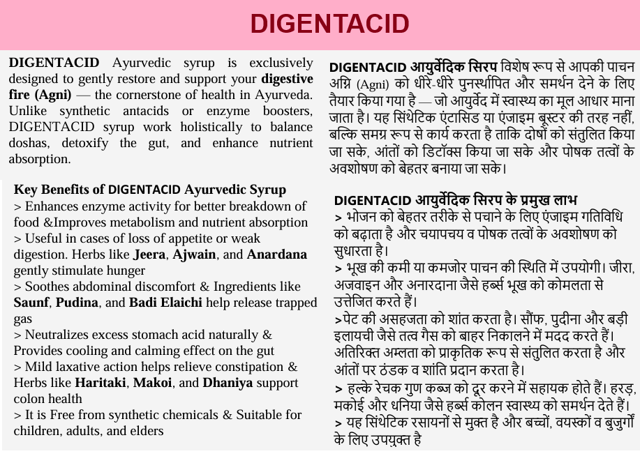 DIGENTACID is a potent blends of traditional herbs, spices, and natural ingredients, carefully chosen to perform multiple functions: from stimulating appetite and enhancing nutrient absorption to reducing acidity, bloating, gas, and promoting healthy bowel movements. They serve as a natural, holistic approach to manage issues like indigestion (Ajirna), hyperacidity (Amlapitta), Irritable Bowel Syndrome (IBS), and general gastrointestinal distress.