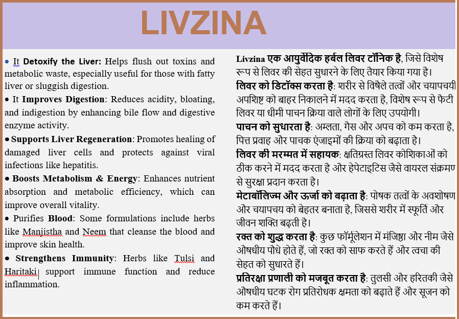 Livzina is an Ayurvedic preparatory/Herbal formulation Liver Tonic, specially prepared for improving Liver health. LIVZINA is a liquid formulation made from herbal medicinal plants and natural ingredients, designed according to the principles of Ayurveda—India’s ancient system of holistic healing. These syrups are typically used to support specific health functions, such as digestion, immunity, hormonal balance, or respiratory wellness.