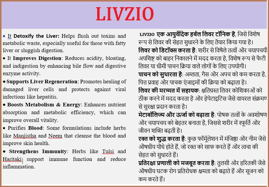 Livzio is an Ayurvedic preparatory/Herbal formulation Liver Tonic, specially prepared for improving Liver health. LIVZIO is a liquid formulation made from herbal medicinal plants and natural ingredients, designed according to the principles of Ayurveda—India’s ancient system of holistic healing. These syrups are typically used to support specific health functions, such as digestion, immunity, hormonal balance, or respiratory wellness.